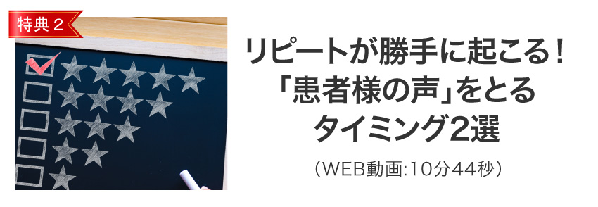 では、どのようにして「患者様の声」を集めればいいのか? そのノウハウはこちらの特典で余すことなくお伝えしています。